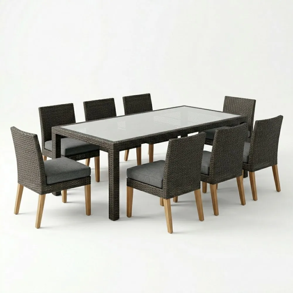 Set Tavolo da Pranzo in Rattan Sintetico e Vetro con 8 Sedie