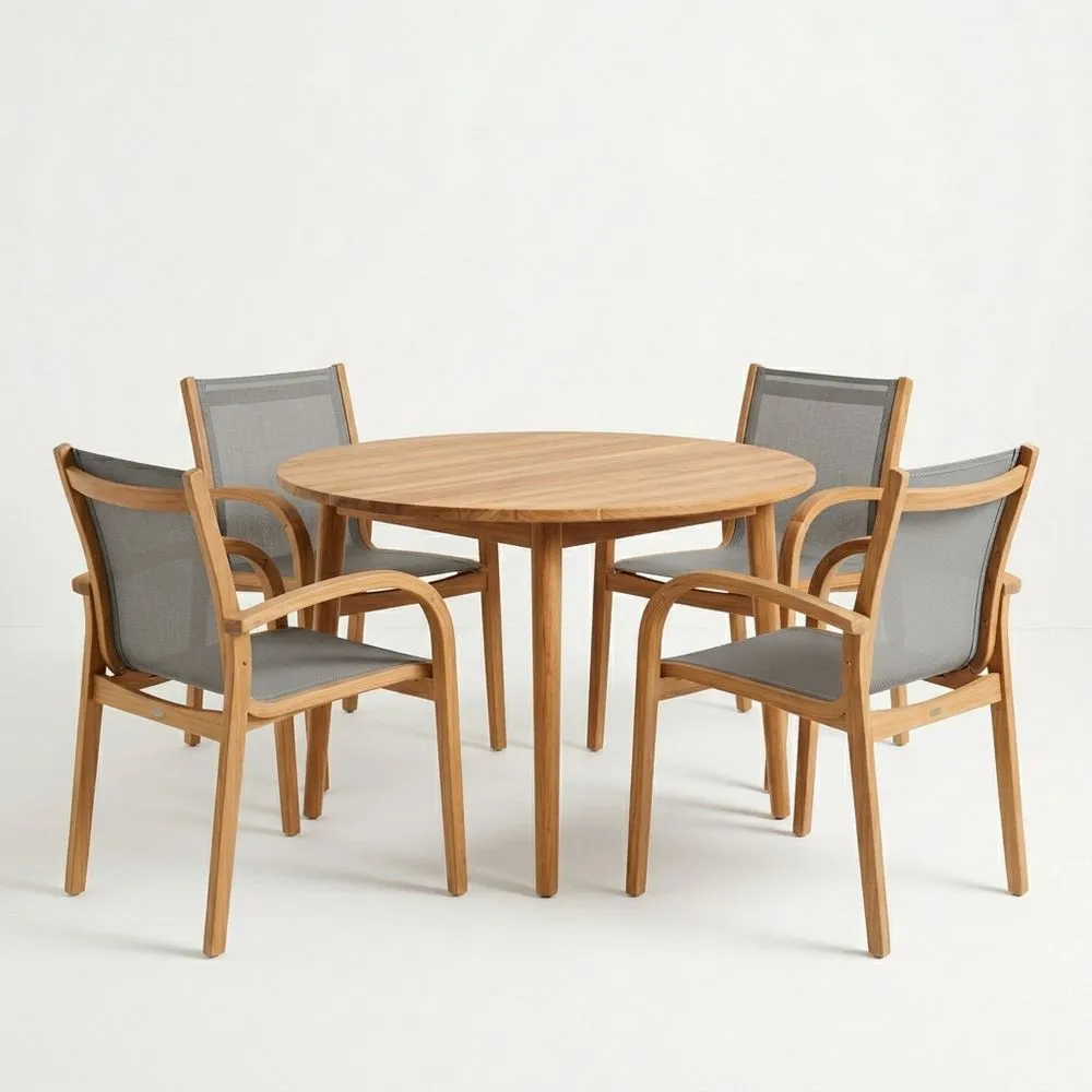 Set da Pranzo da Giardino in Legno di Teak con Tavolo Rotondo e 4 Sedie in Poliestere