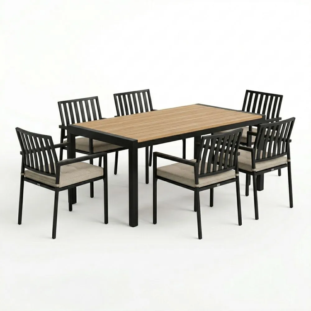Set da pranzo da giardino in legno di acacia con tavolo e 6 sedie in tessuto sintetico