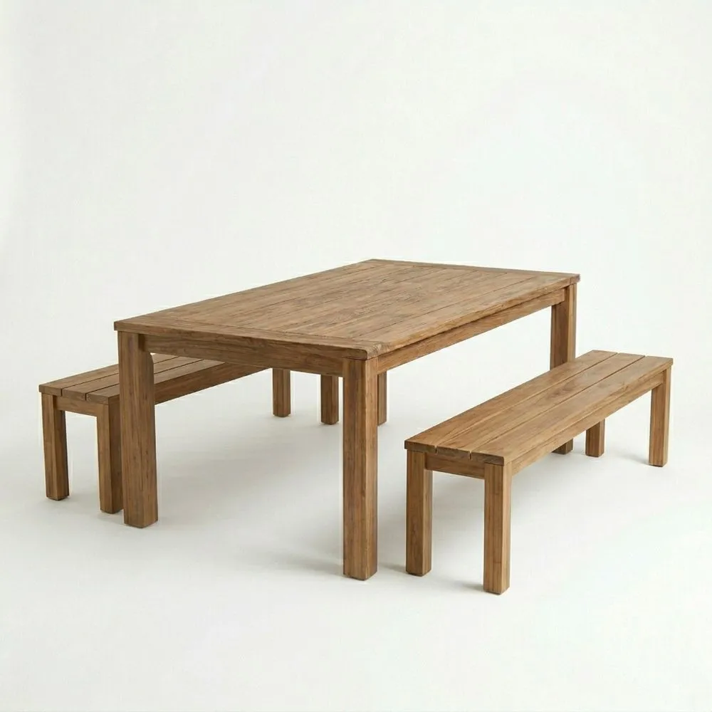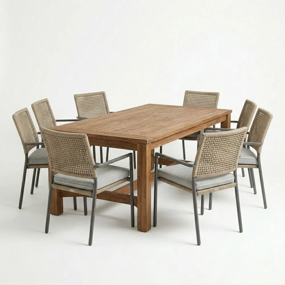 Set da pranzo da esterno in acciaio, legno massello e rattan