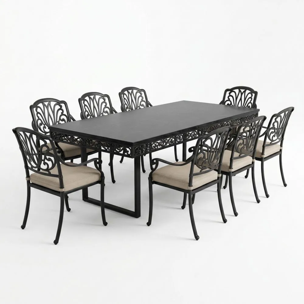 Set da pranzo con tavolo in alluminio e 8 sedie con cuscini beige