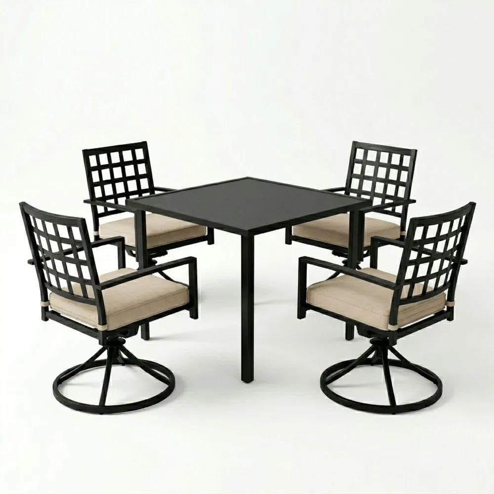 Set da pranzo con tavolo quadrato nero e sedie girevoli in acciaio con cuscini beige