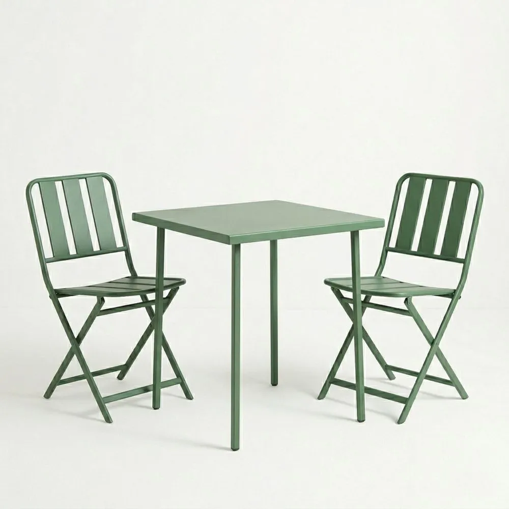 Set da pranzo da esterno in acciaio verniciato verde con tavolo e sedie