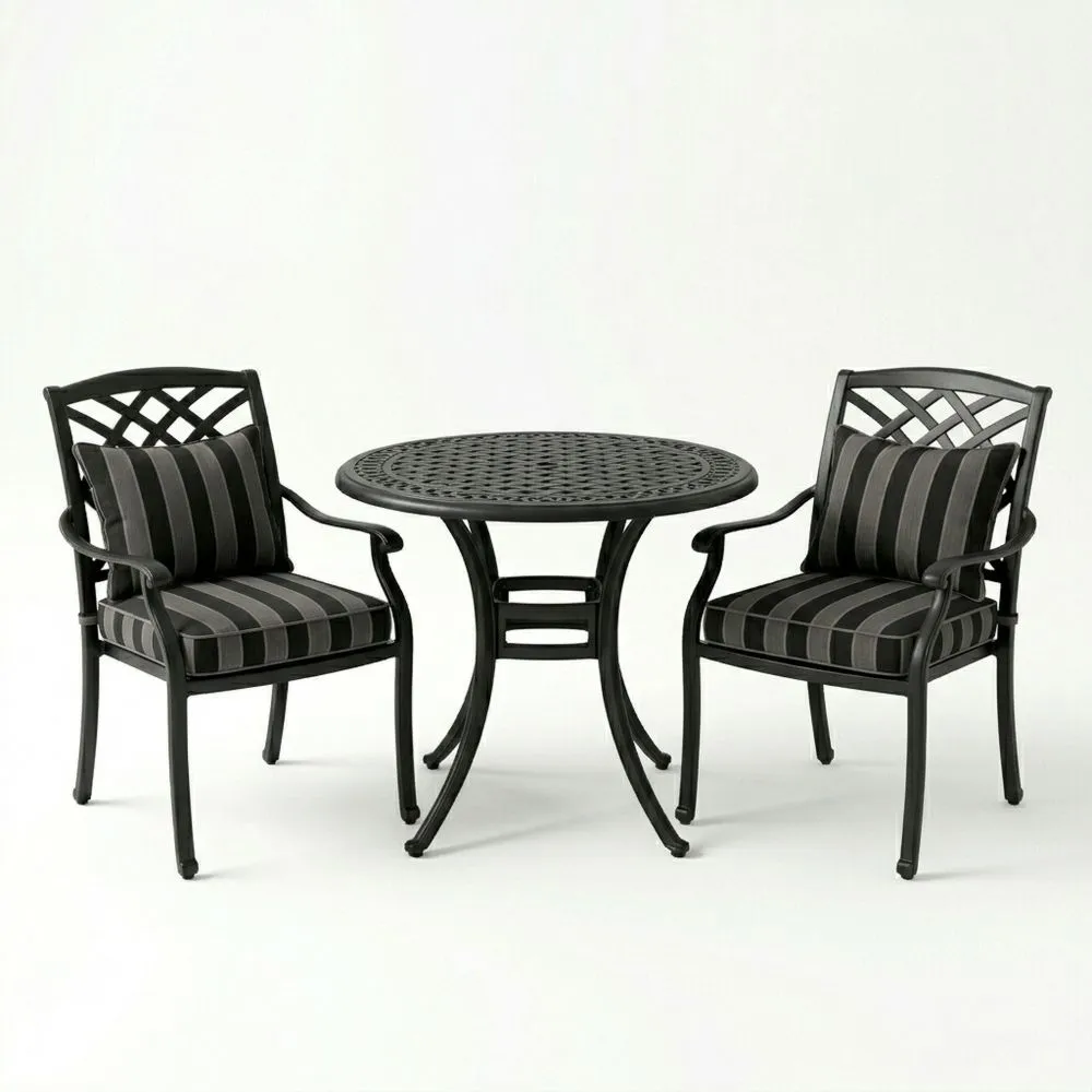 Set sedute relax da giardino con tavolo e sedie in alluminio nero con cuscini rigati