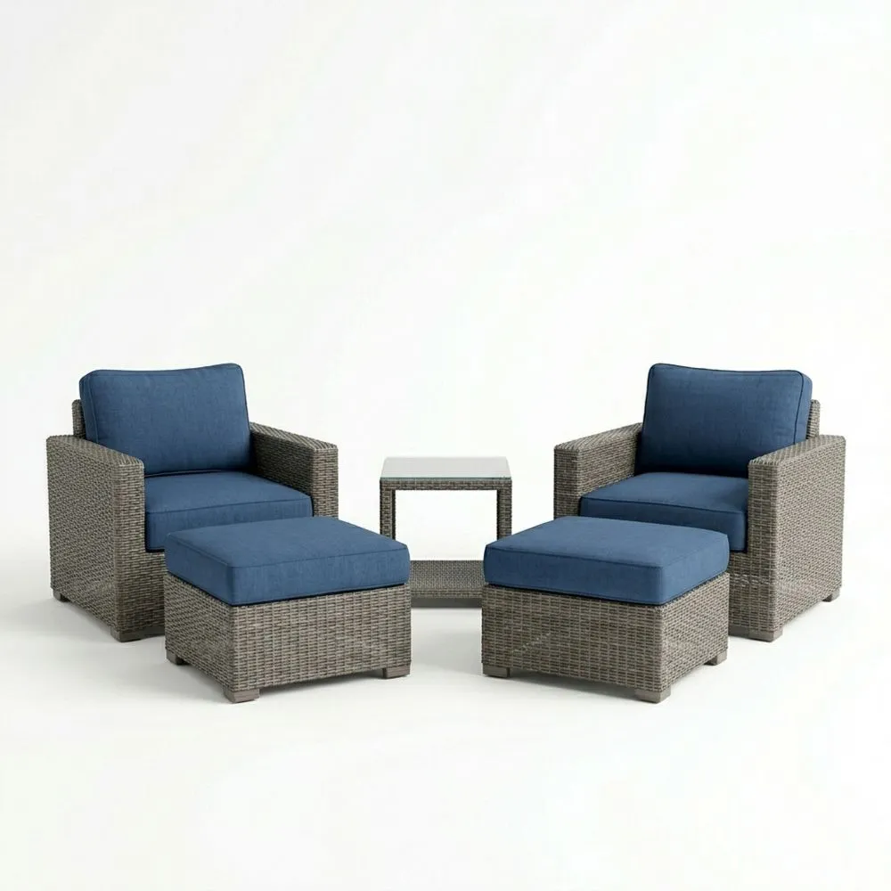 Set sedute relax da giardino in rattan con cuscini blu e tavolino in vetro