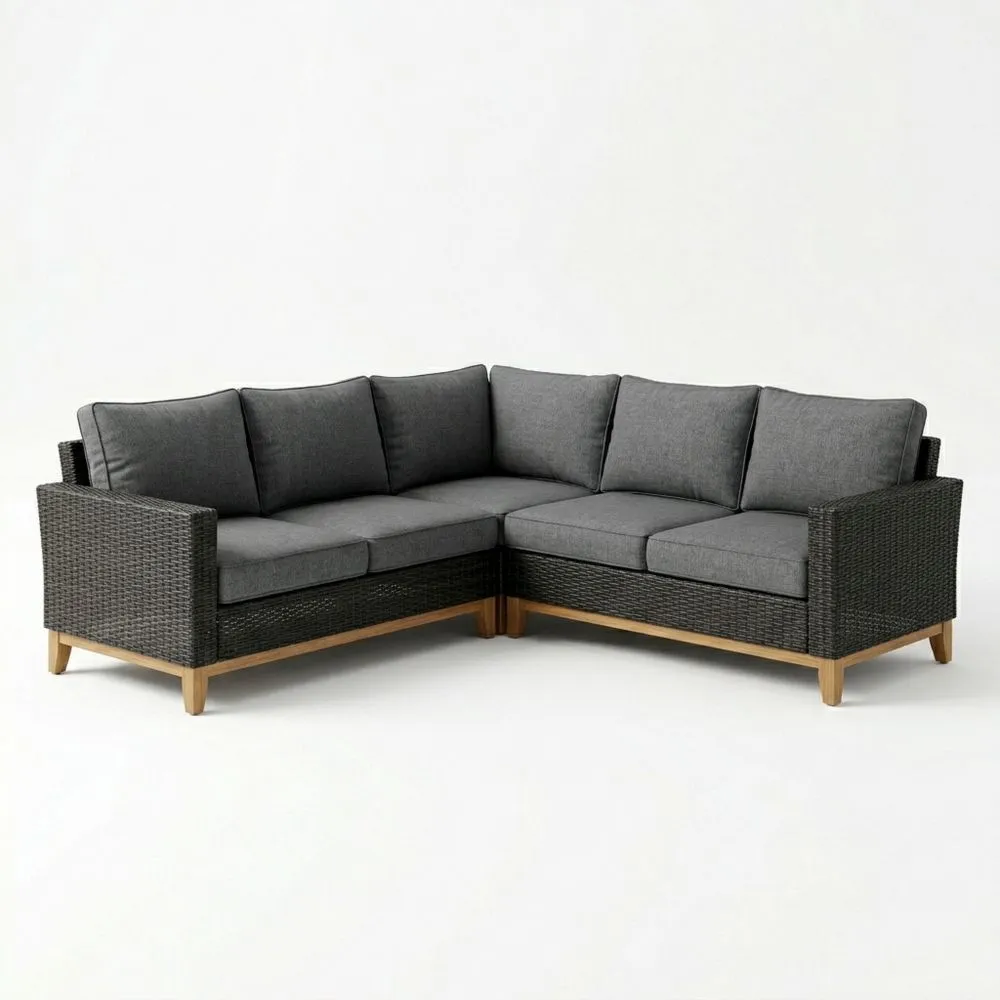 Questo divano angolare è dotato di una struttura in legno massello con rivestimento in vimini sintetico. I cuscini di seduta e schienale sono in poliestere con imbottitura in schiuma di poliuretano. La punta dei piedini è in legno massello per un migliore supporto. Il colore dei cuscini è grigio e il vimini è nero.