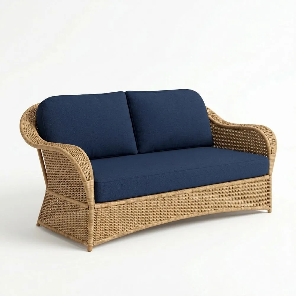 Divano a due posti realizzato in rattan intrecciato con cuscini seduta e schienale in tessuto poliestere. Dimensioni: lunghezza 160 cm, larghezza 75 cm, altezza 85 cm. Adatto per uso esterno.
