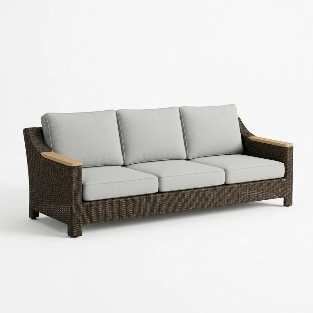 Divano in Rattan Sintetico Marrone Scuro con Cuscini in Poliestere Grigio Chiaro
