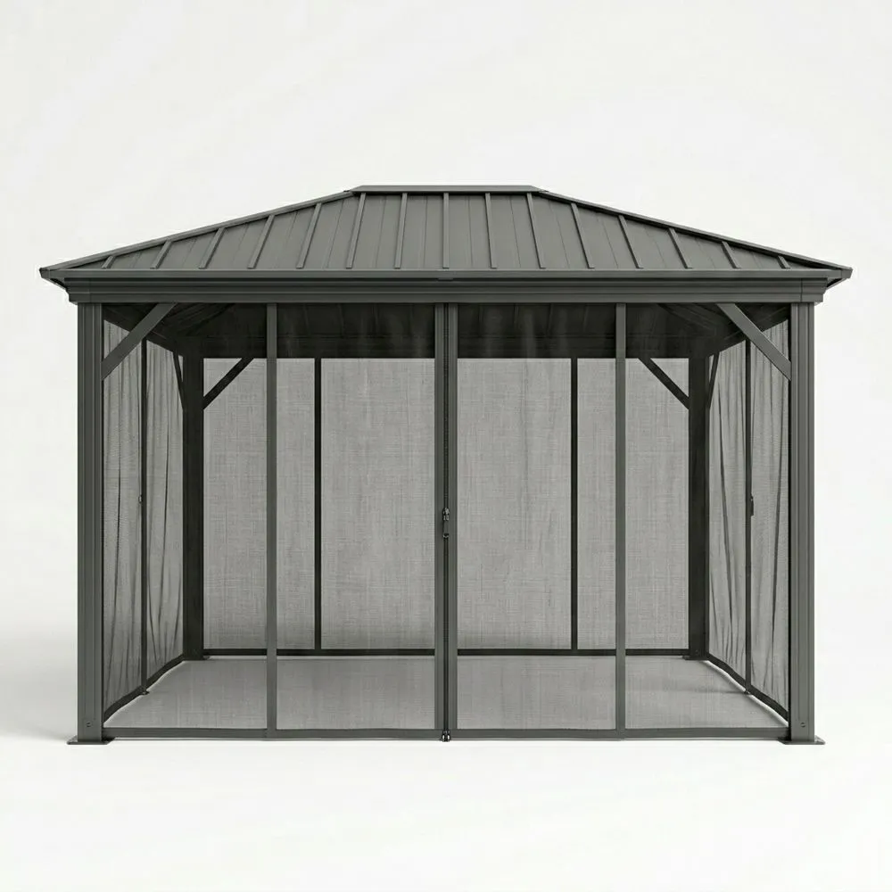 Gazebo con struttura in alluminio e tetto in acciaio, pannelli laterali in rete per protezione. Resistente all'acqua e ai raggi UV. Dimensioni: 300 cm di lunghezza, 400 cm di larghezza, 270 cm di altezza.