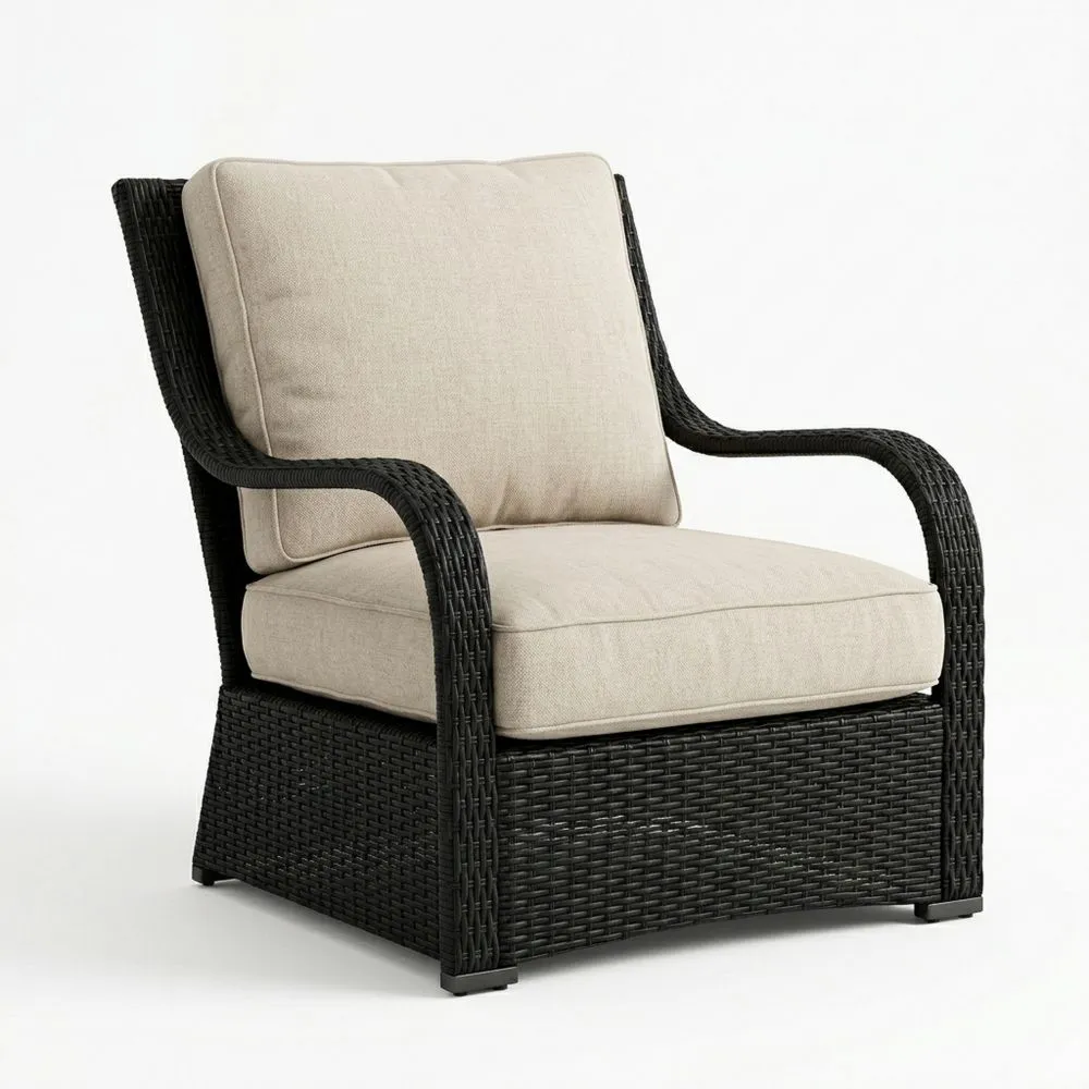 Poltrona in Rattan Sintetico Nero con Cuscini in Tessuto Beige