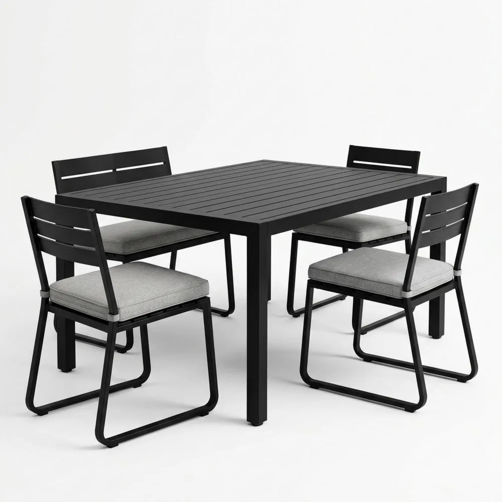 Set da pranzo da giardino composto da un tavolo in alluminio e quattro sedie abbinate.