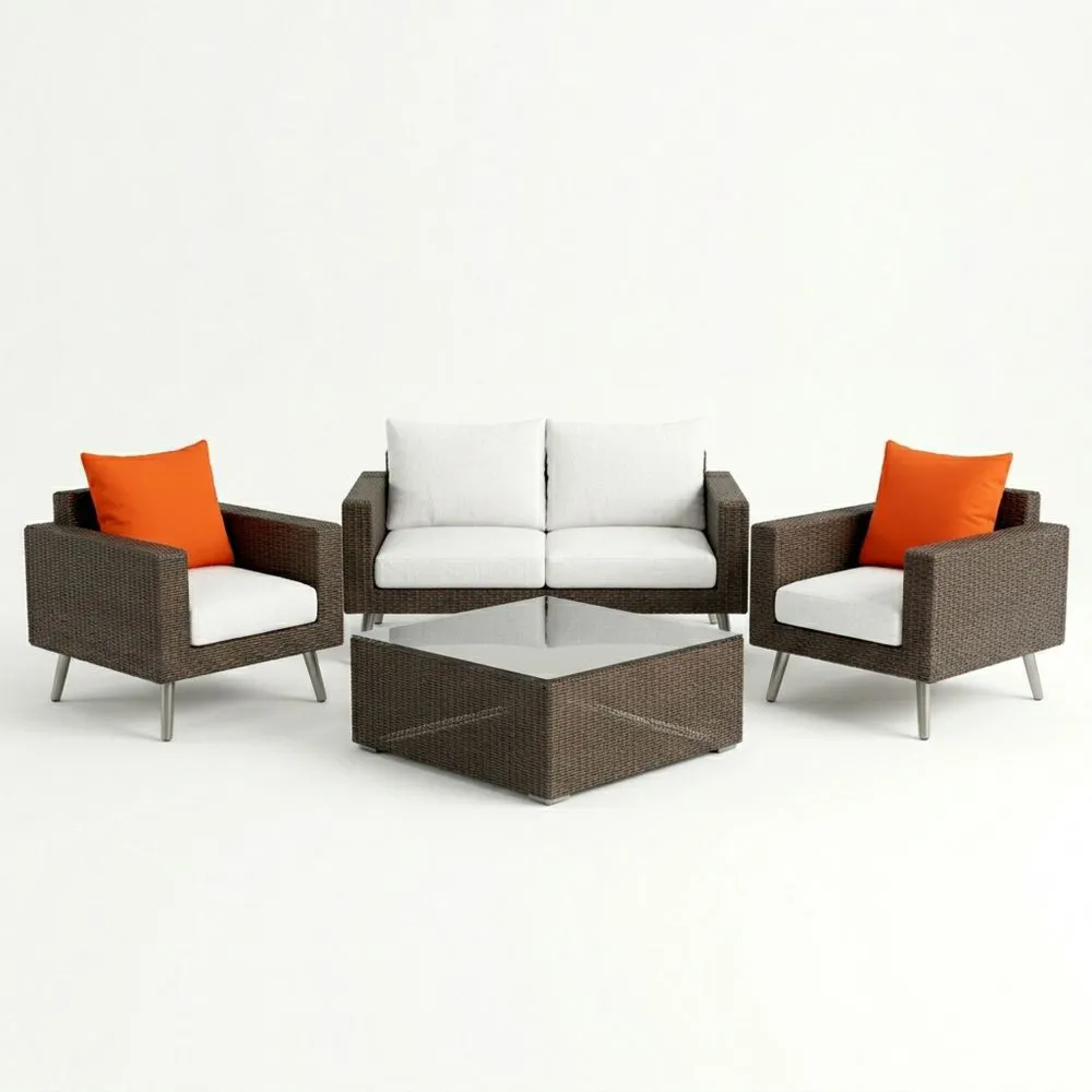 Set mobili da esterno composto da due poltrone, un divano a due posti e un tavolino basso.