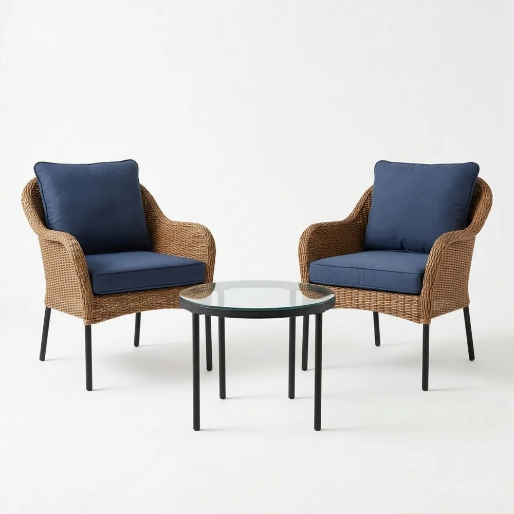 Sedia: Realizzata con struttura in rattan intrecciato e cuscini in tessuto di poliestere blu. Peso massimo supportato: 120 kg.