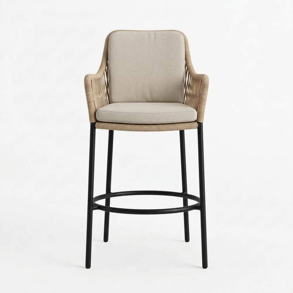 Struttura in acciaio con seduta e schienale in rattan intrecciato. Cuscini in tessuto di poliestere beige imbottiti con schiuma ad alta densità.